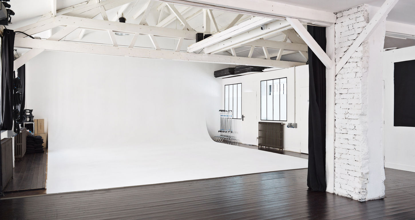 45 m² cyclorama with a 1 m radius deep curve for continuous, soft and enveloping light, ideal for full-length fashion pictures.